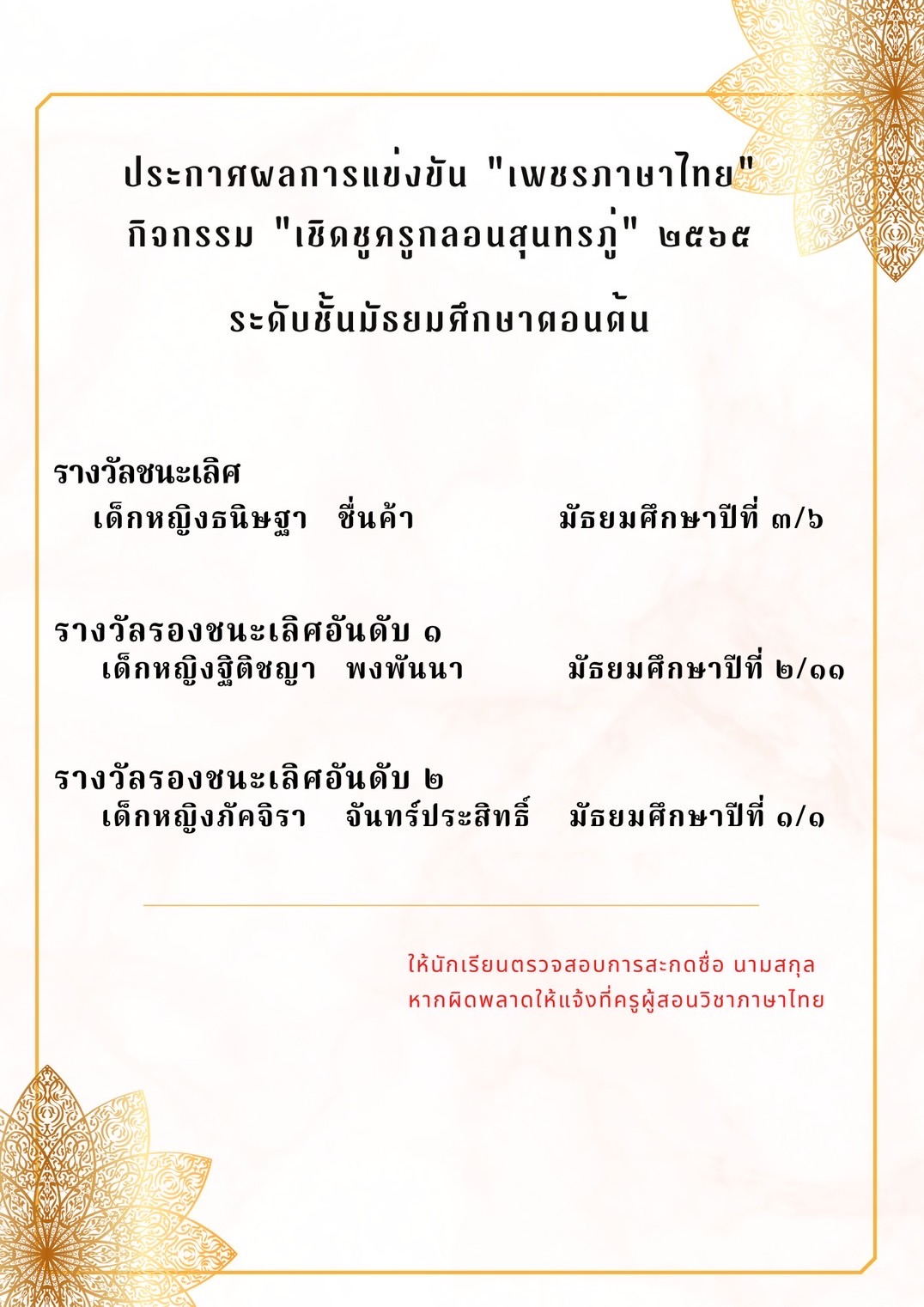 ประกาศผลการแข่งขันเพชรภาษาไทย ระดับชั้นมัธยมศึกษาตอนต้น เนื่องในวันสุนทรภู่ประจำปี ๒๕๖๕