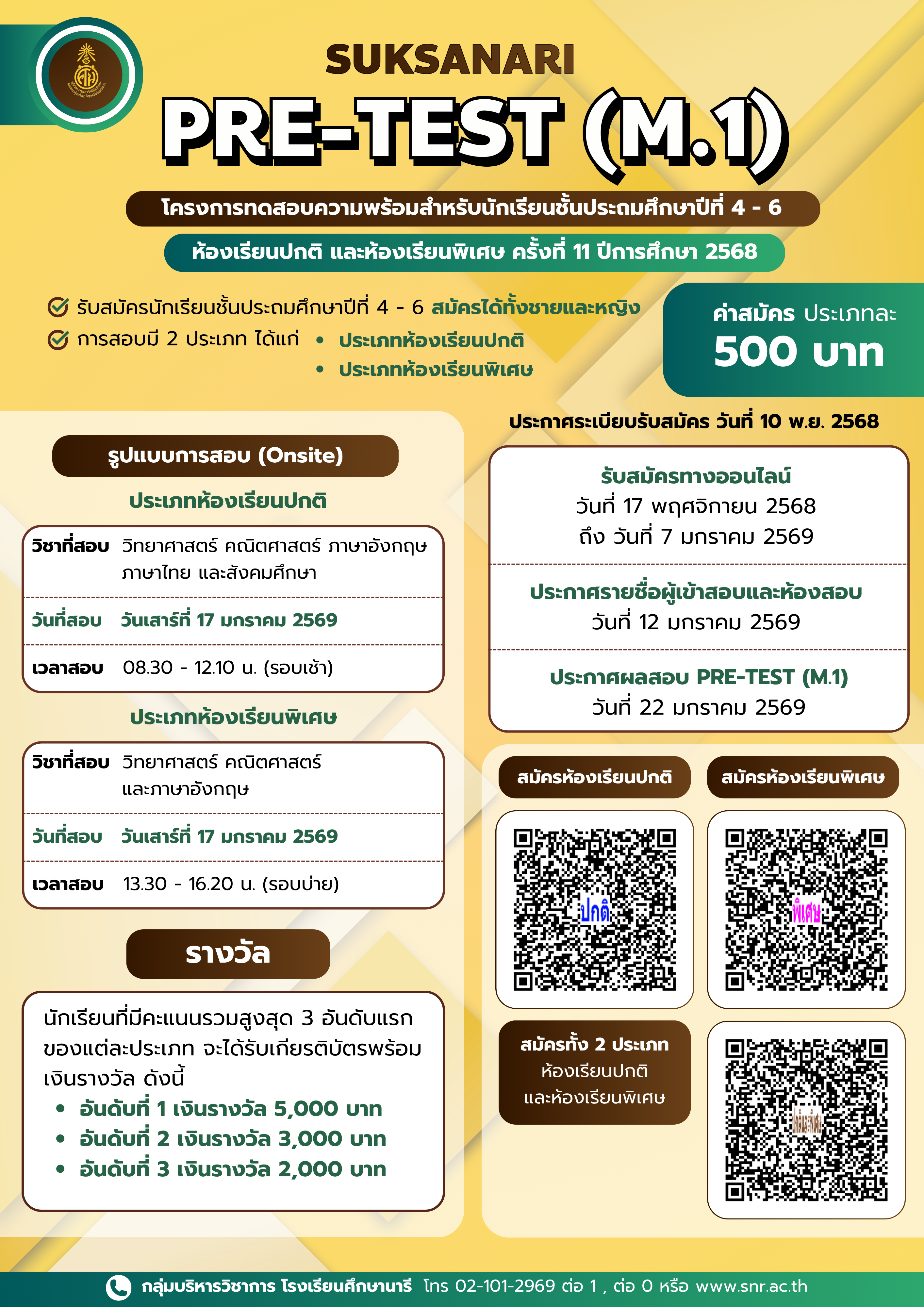 รับสมัครโครงการทดสอบความพร้อมสำหรับนักเรียน Pre-Test (M.1) ครั้งที่ 11 ปี 2568